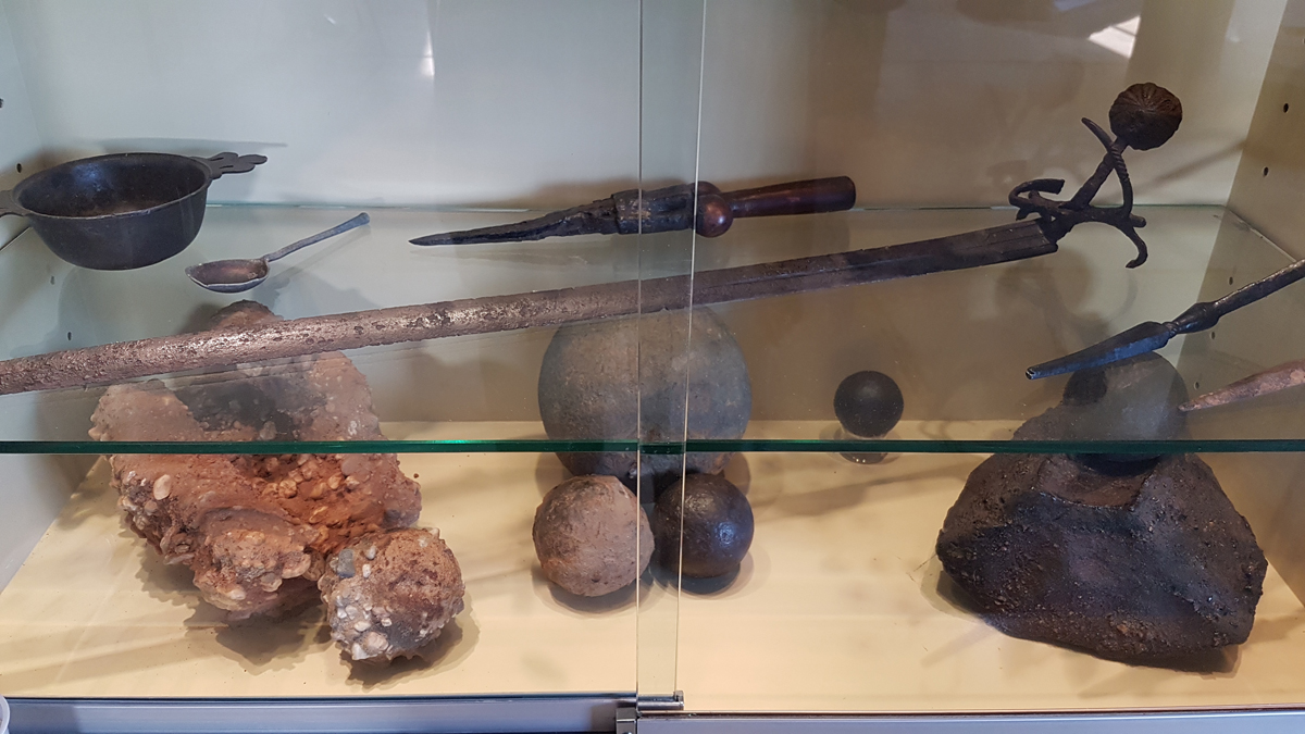 Ontelbare musketkogels, kanonskogels in alle soorten en maten, resten van door oververhitting geëxplodeerde kanonnen, punten van hellebaarden, pijlpunten, dolken en zwaarden, maar ook aardewerk, pijpen, munten, kledingaccessoires, eetgerei, luxe tinnen vaatwerk, slachtafval, speelgoed en visgerei. Het is een voorlopige maar flinke opsomming van de vele overblijfselen die werden gered in de beginjaren van het project Over de Maas. Overblijfselen die herinneren