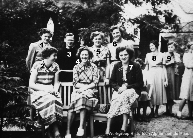 De onderstaande foto is al lang in ons bezit maar heeft op tentoonstellingen weinig reacties opgeleverd. Nr. 4 zou Jo Steenbruggen kunnen zijn. Nr. 7 is mogelijk Cor van Kraaij-van de Velden. Door de pater met nr. 3 en de tuin met het Mariabeeld dachten we dat het hier om een ongedwongen foto tijdens een retraite zou gaan.