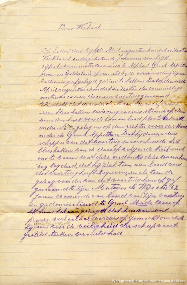 Bakenmeester Van Dijk voer elke dag met zijn roeibootje de Maas op om de stand van het water te peilen. Zijn bootje was wit met bruin geverniste strepen.