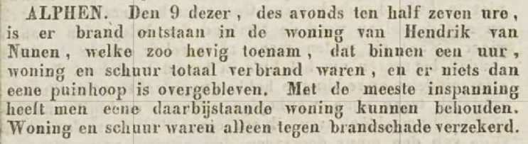 De oudste vermelding van een brand in Alphen die wij in de kranten terugvonden was op 12 maart 1845. Volgens de Nieuwe Tielsche Courant, waarin we dit bericht vonden, is bij Hendrik van Nunen op 9 maart 1845 "des avonds ten half zeven ure" brand ontstaan in de woning. Binnen een uur waren woning en schuur totaal verbrand en bleef er niets dan een puinhoop over.