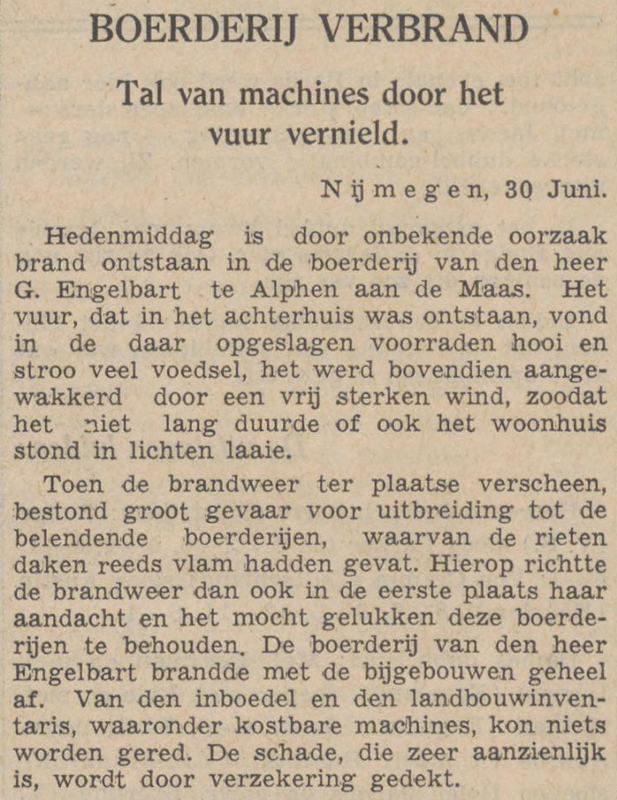 Op woensdagmiddag 30 juni 1937 brak er door onbekende oorzaak brand uit in de boerderij van G. Engelbart in Alphen.