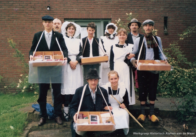 Als marskramers verkleed, gingen ze langs de deuren en met de verkoop van pennen, kaarten, etc. werd het prachtige bedrag van fl. 1.800,-- binnengehaald.