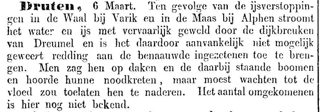 In de Maas bij Maasbommel en Alphen raakt het ijs in de nacht van 5 op 6 maart in beweging en brengt de dijken door zware overloop in zeer dreigend gevaar. Bij de molen in Alphen lukt het met veel inspanning om de dijk te behouden. Daarbij is het voor Maas en Waal gunstig dat de dijk aan de Brabantse kant (Lith en Alem) wel doorbreekt!