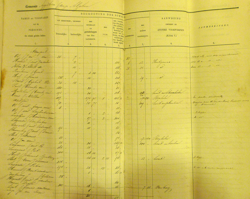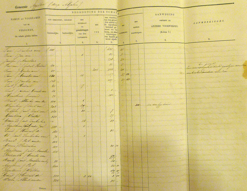 In het totaal kregen 106 gezinnen een schadevergoeding en werd een bedrag van 2637 gulden uitgekeerd, gemiddeld zo’n 25 gulden.