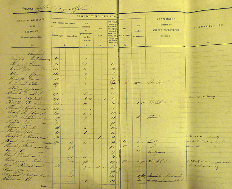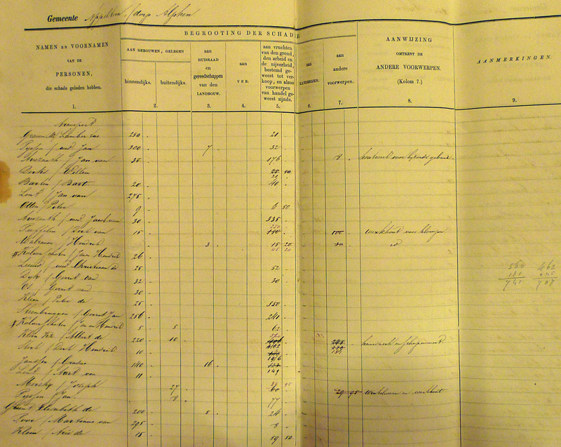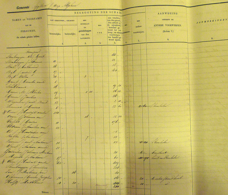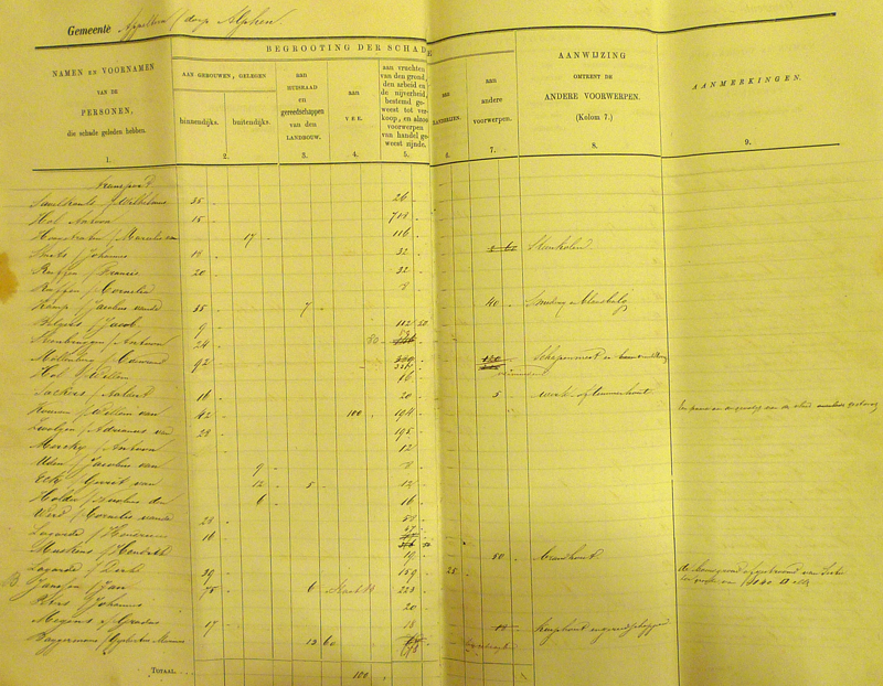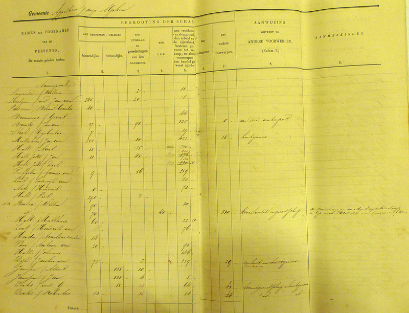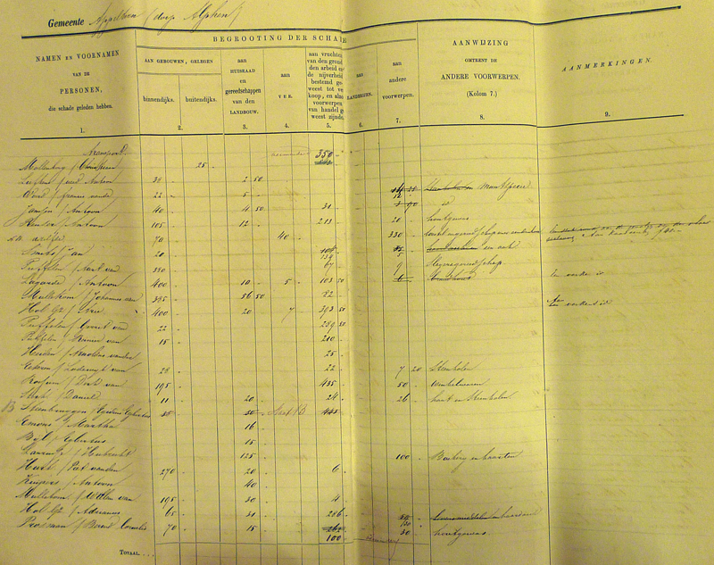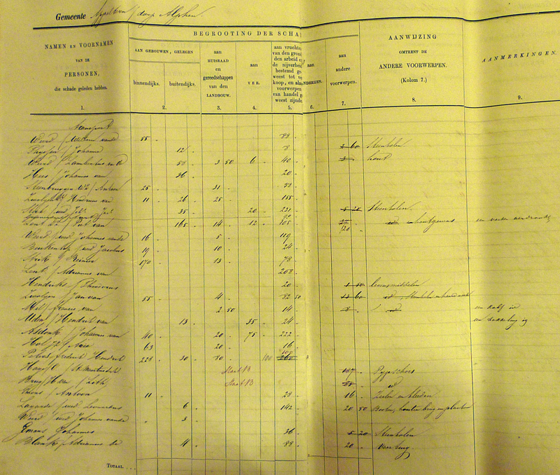 Gradus van Toor kreeg de meeste schadevergoeding (208 gulden), direct gevolgd door kooiman Willem Croes (201 gulden). Op de derde plaats vinden we de hoofdonderwijzer Hubrecht Laurusse met 125 gulden. Deze bedragen maken wel duidelijk dat veel mensen het met bedragen onder de 10 gulden moesten doen. En zo lijkt het dat, zoals Van Heiningen later over de watersnood van 1926 schrijft, ook in 1861 al gold: wie niks heeft, kan niks verliezen…………