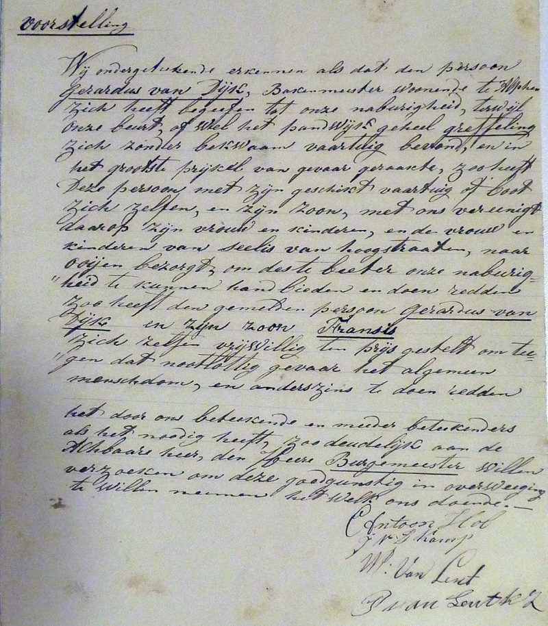T.a.v. de verrichtingen van bakenmeester Van Dijk en zijn zoon schrijven de buurtbewoners van geheel Greffeling nog dat hij 'met zijn geschikt vaartuig of boot zijn vrouw en kinderen en de vrouw en kinderen van Seelis van Hoogstraten naar Ooijen bezorgt' en hij heeft zich zo 'vrijwillig ten prijs gesteld om teegen dat nootlottig gevaar het algemeen menschdom, en anderszins te doen redden'.