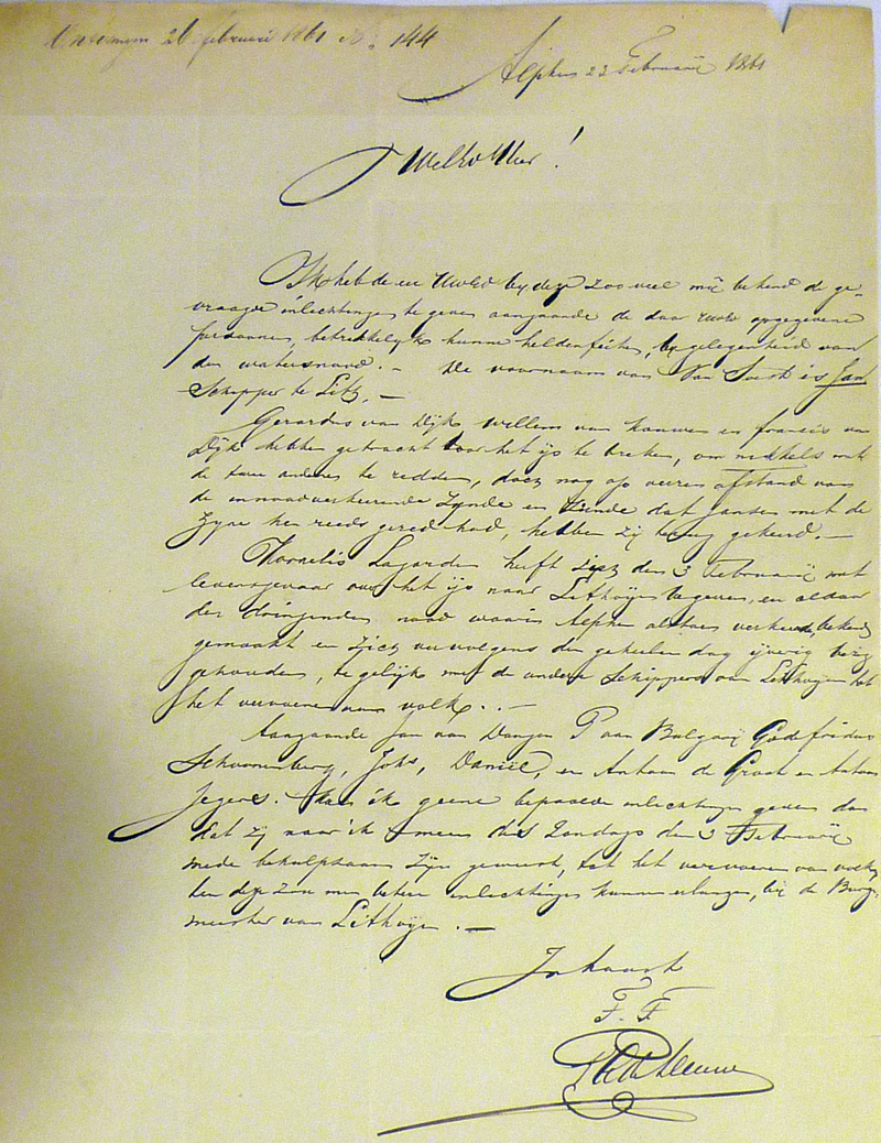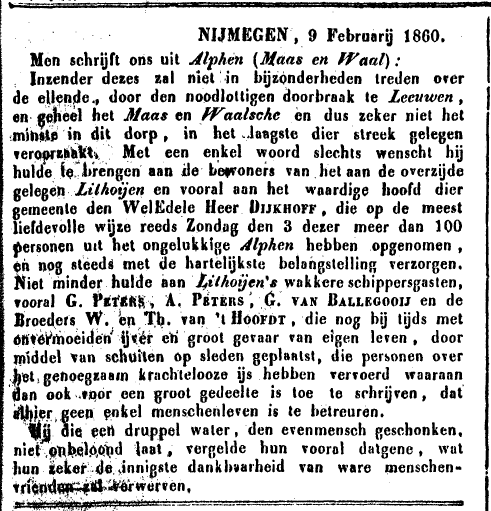 Van bakenmeester Gerardus van Dijk en zijn zoon Fransis, en Willem van Kauwen schrijft hij dan terug dat ze wel hebben getracht door het ijs te breken, maar toen ze de drenkeling naderden zagen, dat Janssen en de zijnen ze reeds gered hadden. De andere personen zijn vanuit Lithoijen bezig geweest met het vervoer van slachtoffers.