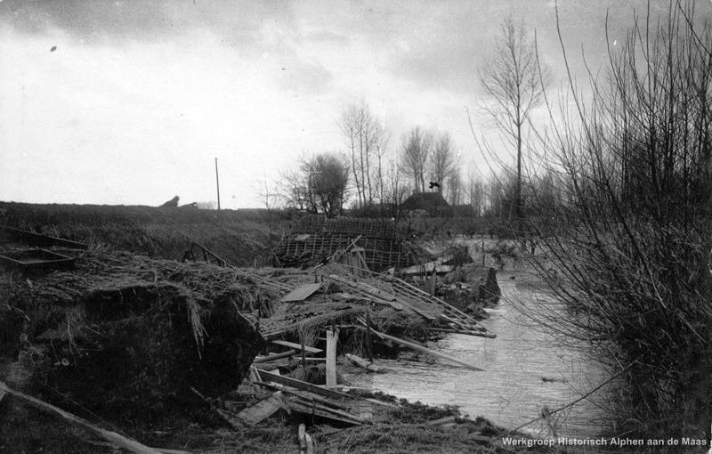 In de morgen van 2 januari kwam het water in de laagst gelegen polder van Alphen. De nieuwe weg Tiel-Wamel liep toen over als een kleine waterval.