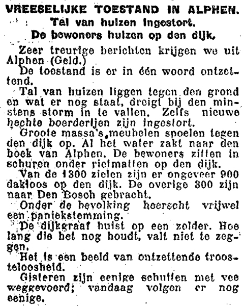 Nog steeds kwam de vloed hoger. In de openbare lagere school van Alphen waren aanvankelijk 10 gezinnen gehuisvest, die zich daar veilig waanden. Binnen de kortste keren moesten zij echter vluchten omdat het water in de school al snel een hoogte van 1 meter bereikte. Er moest nog meer hulp komen. Niet alleen voor de bewoners, maar ook voor het vee. Het vee, dat vanwege de geringe hoeveelheid hooi, en gebrek aan stalling een gewisse dood tegemoet ging. Meer hulp kwam spoedig. Gehuurde schepen brachten de eerste vluchtelingen over naar de meer veilige plaatsen. Aanvankelijk trokken een 200-tal mensen naar Den Bosch, vanuit Alphen. In Den Bosch waren alle beschikbare plaatsen ingenomen door mensen uit Dreumel zodat de Alphenaren verder getransporteerd werden naar Tilburg. Het was een droevig gezicht, om moeders met kinderen van enkele maanden oud zien te vertrekken. Het was erg voor hun, om de hun dierbare landstreek te moeten verlaten. Dit alles om hun leven in veiligheid te stellen. |
