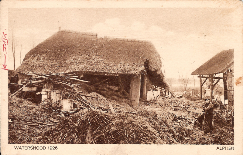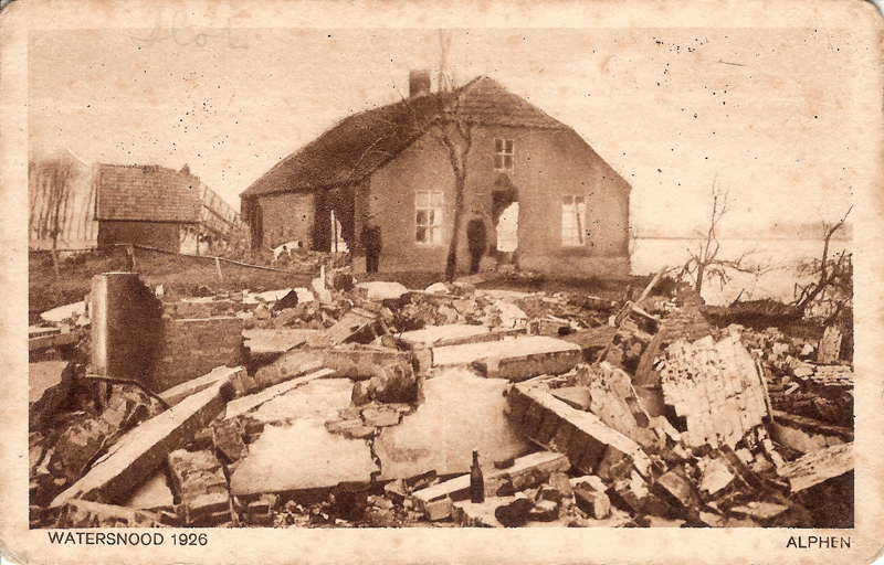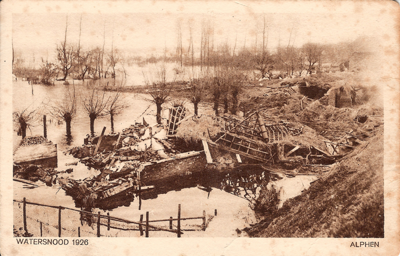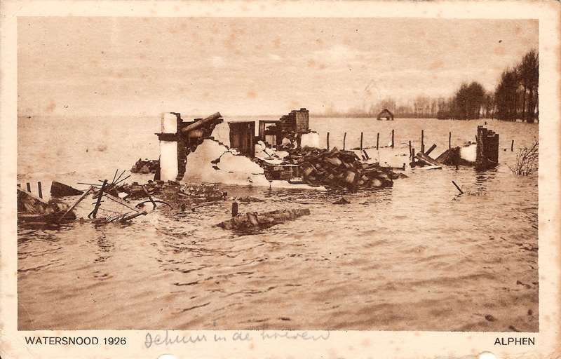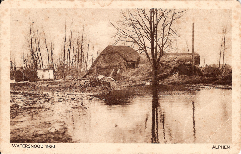 Na de watersnood van 1926 werd er van elk dorp een serie ansichtkaarten uitgegeven met afbeeldingen van deze watersnood. Van Alphen zijn er zes verschillende. We hebben nog niet alle locaties kunnen plaatsen. Wij horen het graag als iemand ons daar meer over kan vertellen. Klik op de afbeeldingen voor een vergroting.