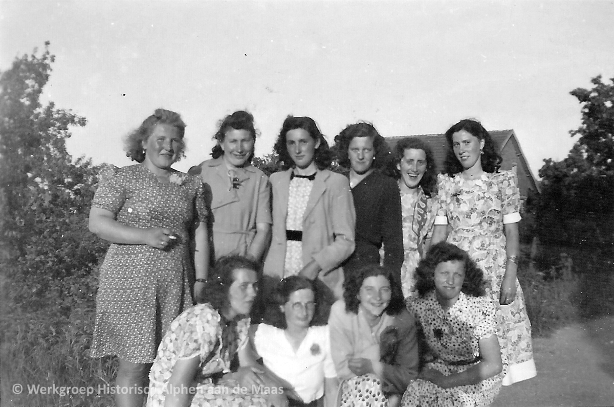 Zittend v.l.n.r. Nel van Wichen, Lena van de Wert of Joke Hol of Marie van den Oever-Schonenberg, Marie Meijs, Jo Steenbruggen.