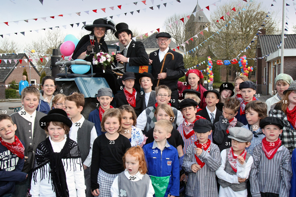 We zien een aantal deelnemers van de boerenbruiloft die in 2010 werd gehouden tijdens de viering van het veertigjarig jubileum van basisschool Mariënhof.