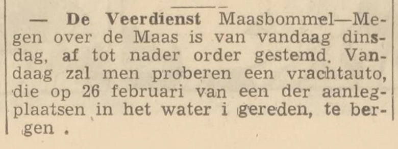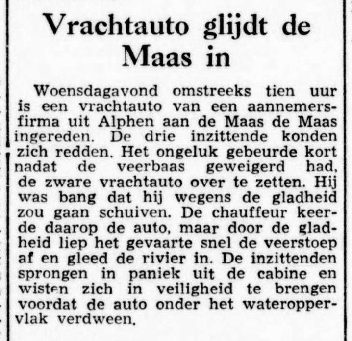 Via een eerste reactie van Corjan Strik werden we op het spoor gezet en hoorden we van Cor van Avezaath en Wim van Ooijen dat hun broers Frans en Thé samen met Geert Verhoeven in deze vrachtwagen van aannemer Johan van Heck zaten. In verband met de lage waterstand (de stuw was er uit) kon de wagen niet op de veerpont. Bij het omdraaien op de veerstoep ontstond de slippartij. Pas twee weken later is de wagen opgetakeld met de hulp van militairen. Zie ook het tweede krantenbericht dat daarover op 11 maart 1958 in het Algemeen Dagblad stond.
